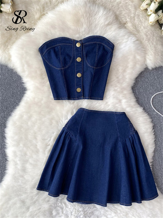 Denim Strapless Sexy Top+ Short A Line Skirt Set