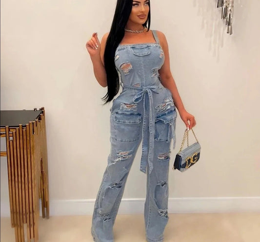 Hole Tassels Denim Strap Sleeveless Jumpsuit