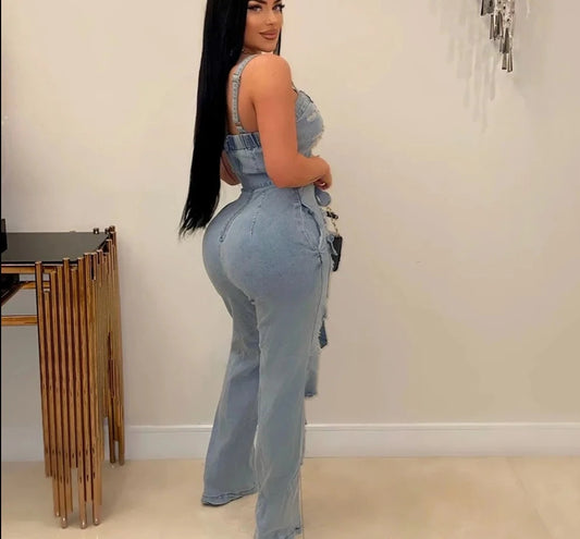 Hole Tassels Denim Strap Sleeveless Jumpsuit