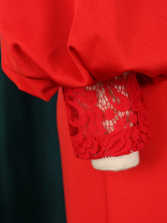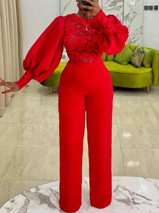 Elegant Puffy Long Sleeve Lace Stitching See Through Wide Leg Pants Elastic Romper