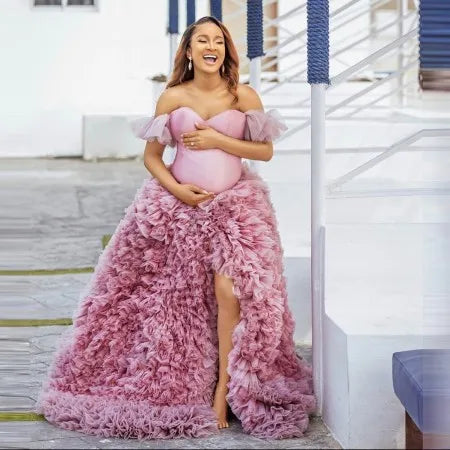 Cap Sleeves Satin Strapless Ruffles Pleated Front Slit Extra Puffy Pregnancy Gown