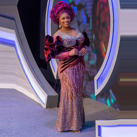 O Neck Patchwork Mesh Beaded Gown