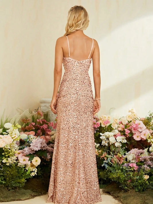 V-neck sequin flanged slit fishtail skirt Evening dress