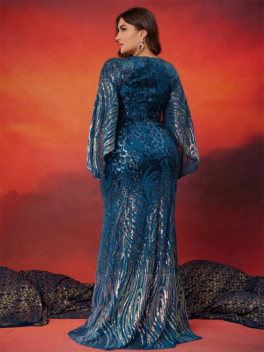 Plus Size Elegant Long Sleeves Sequins Blue Evening Dress