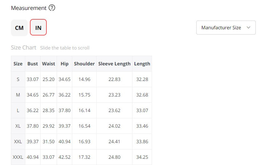| Size | Bust | Waist | Hip | Shoulder | Sleeve Length | Length |