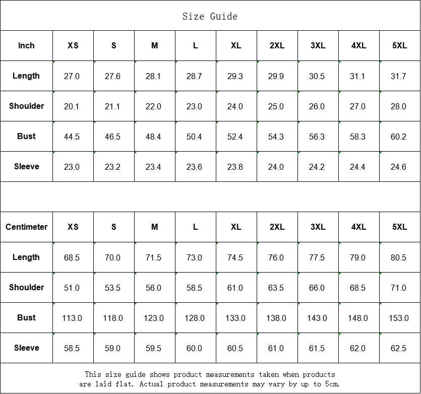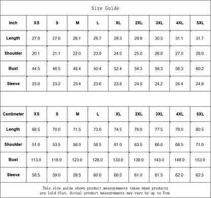 | Centimeter | S | M | L | XL | 2XL | 3XL | 4XL | 5XL |
