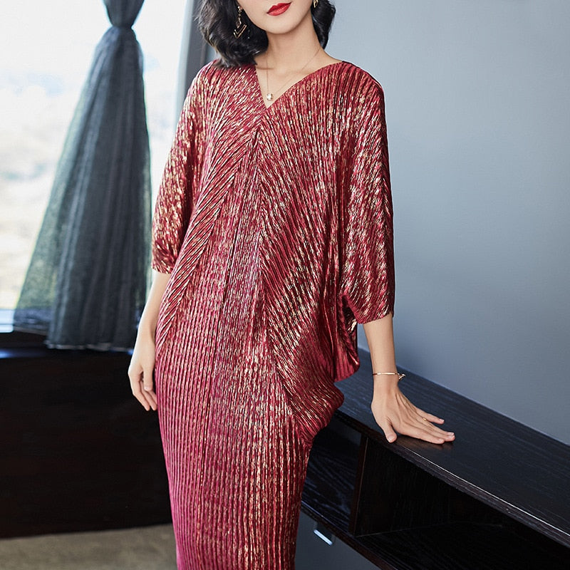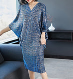 High Quality New Fashion V Collar Pleats Batwing Sleeve Loose Dress