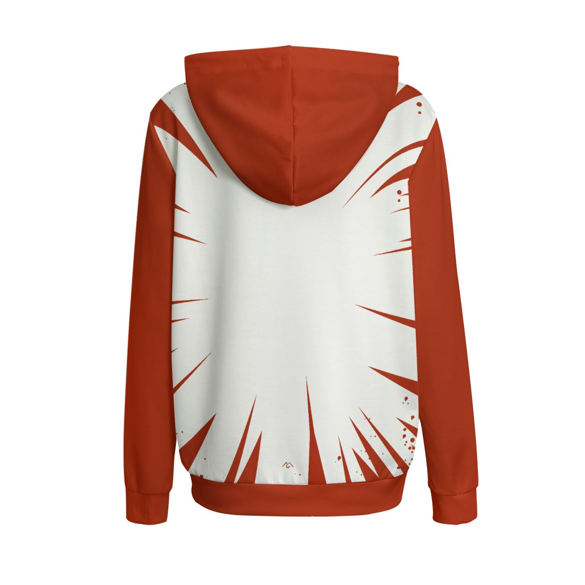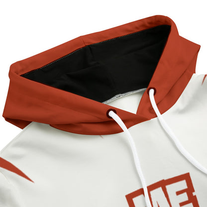 - White drawstring, front pocket and black inner hood