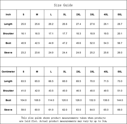 | Centimeter | S | M | L | XL | 2XL | 3XL | 4XL | 5XL |