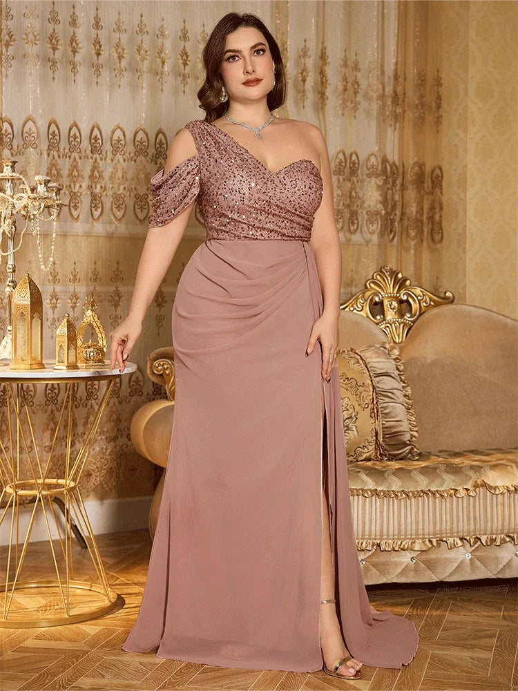 Off-Shoulder Floor-Length Shiny Sequined Chiffon Big Size Gown