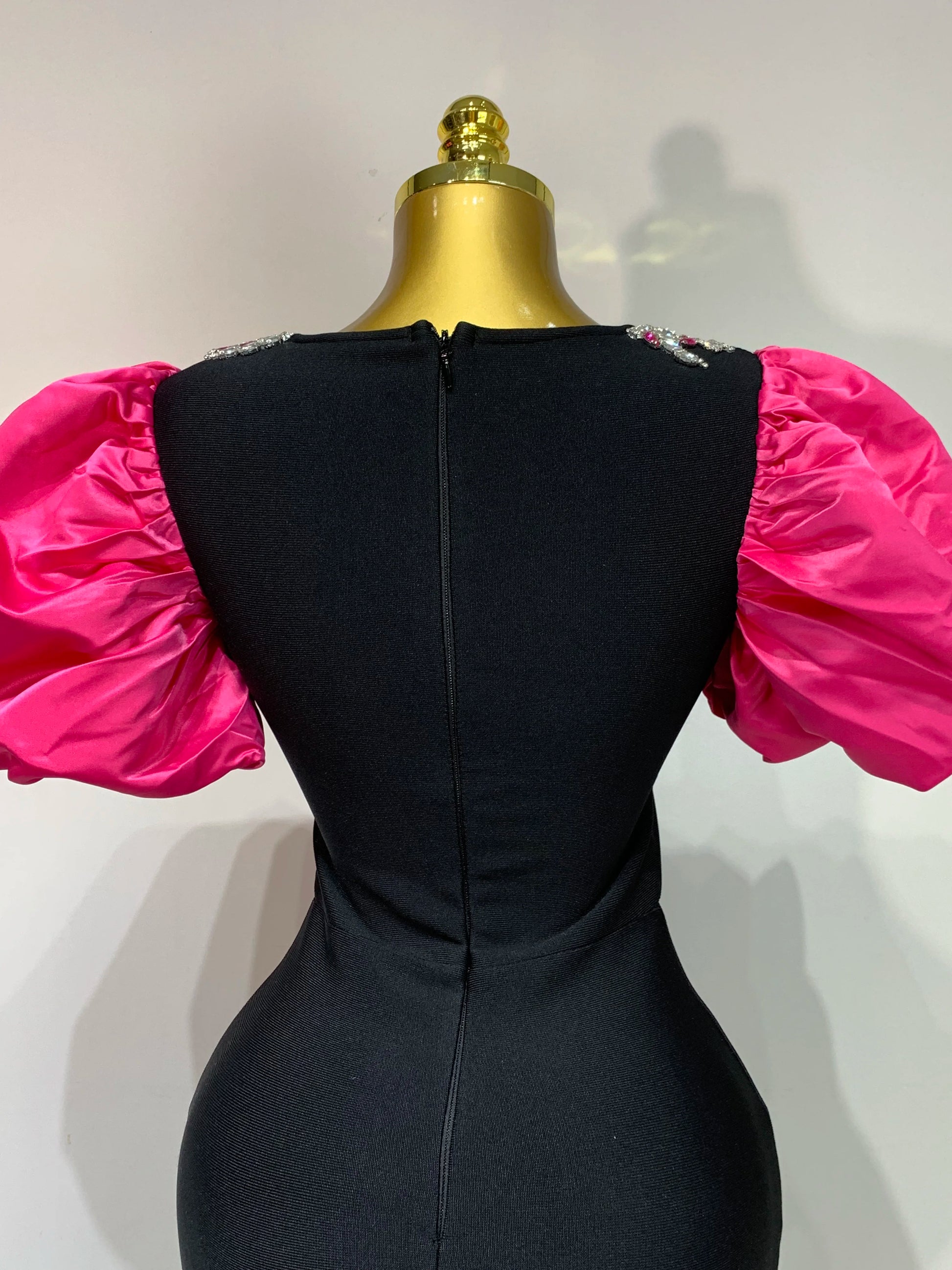 Puff Sleeve Square Collar Shinning Crystal Bodycon Long Dress