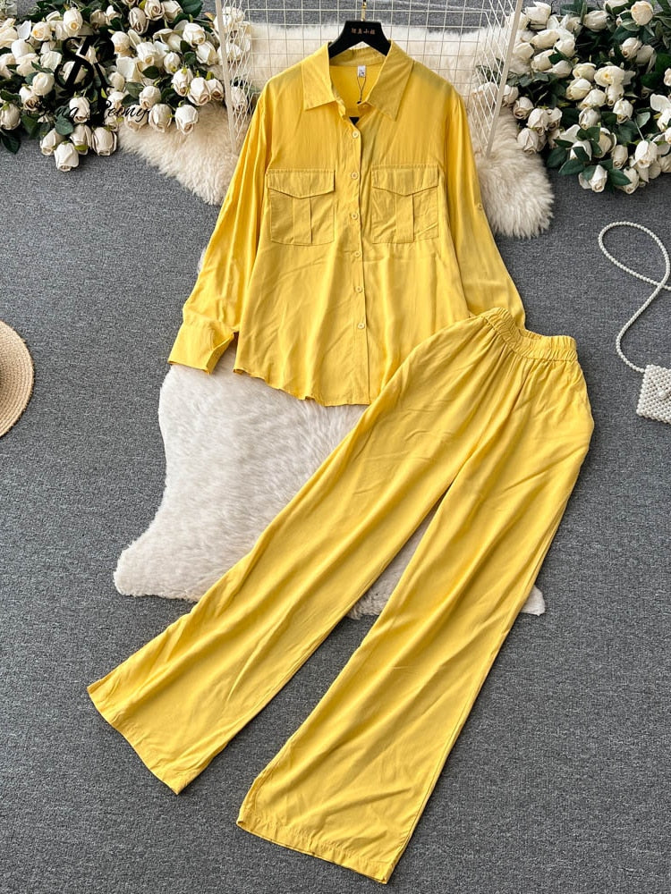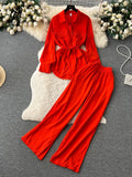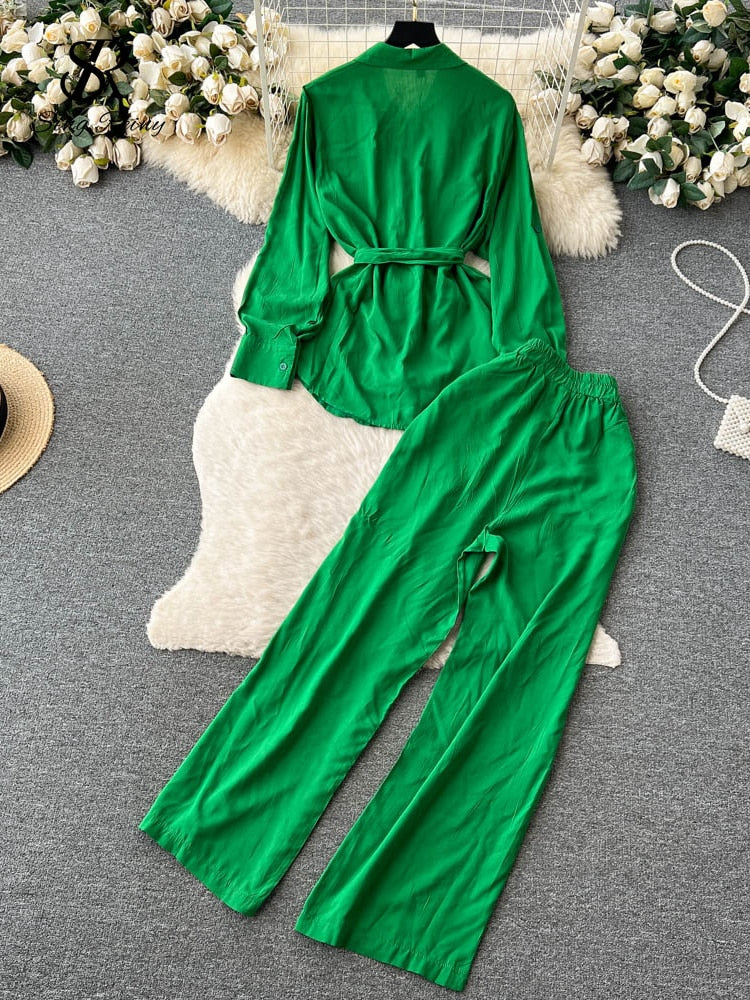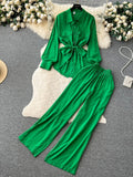 Solid Long Sleeves Loose Belt Shirt + Wide Legs Elastic Waist Pant Two Piece Set